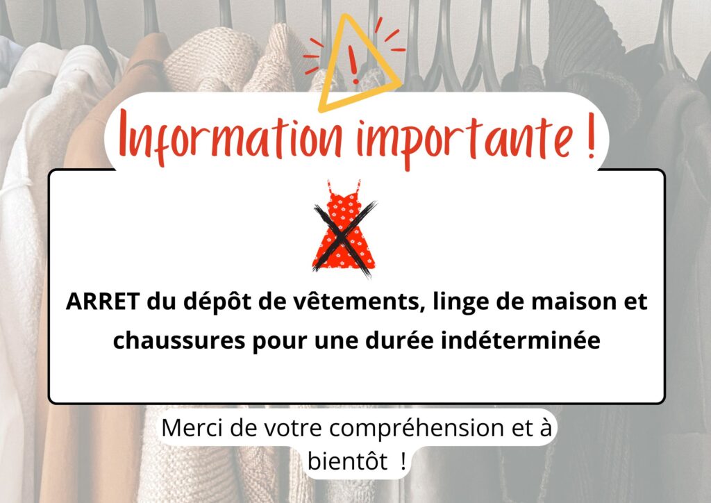 FERMETURE du dépôt de vêtements, linge de maison et chaussures pour une durée indéterminée : nous croulons à nouveau sous les textiles avec environ 2 tonnes collectées depuis le début de l’année 2025. La filière étant toujours en tension nous sommes soumis à des contraintes difficiles qui nous forcent à suspendre la collecte pour des raisons logistiques et des raisons d’hygiène et de sécurité pour nos équipes. Merci pour votre compréhension !Pour les vêtements, chaussures et le linge de maison, nous collectons uniquement du linge de saison : de septembre à janvier ==> collecte automne-hiver ; de mars à juillet ==> collecte printemps-été. Le dépôt de vêtements, chaussures et linge de maison est donc FERME en février et en août.