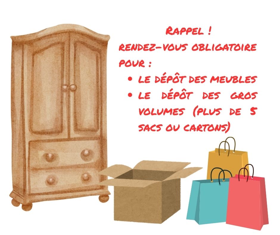 Pour les meubles (armoires, buffets, tables, etc) et gros volumes (au delà de 5 sacs/cartons), merci de nous contacter avant de vous déplacer : une prise de rendez-vous est nécessaire pour pouvoir déposer !